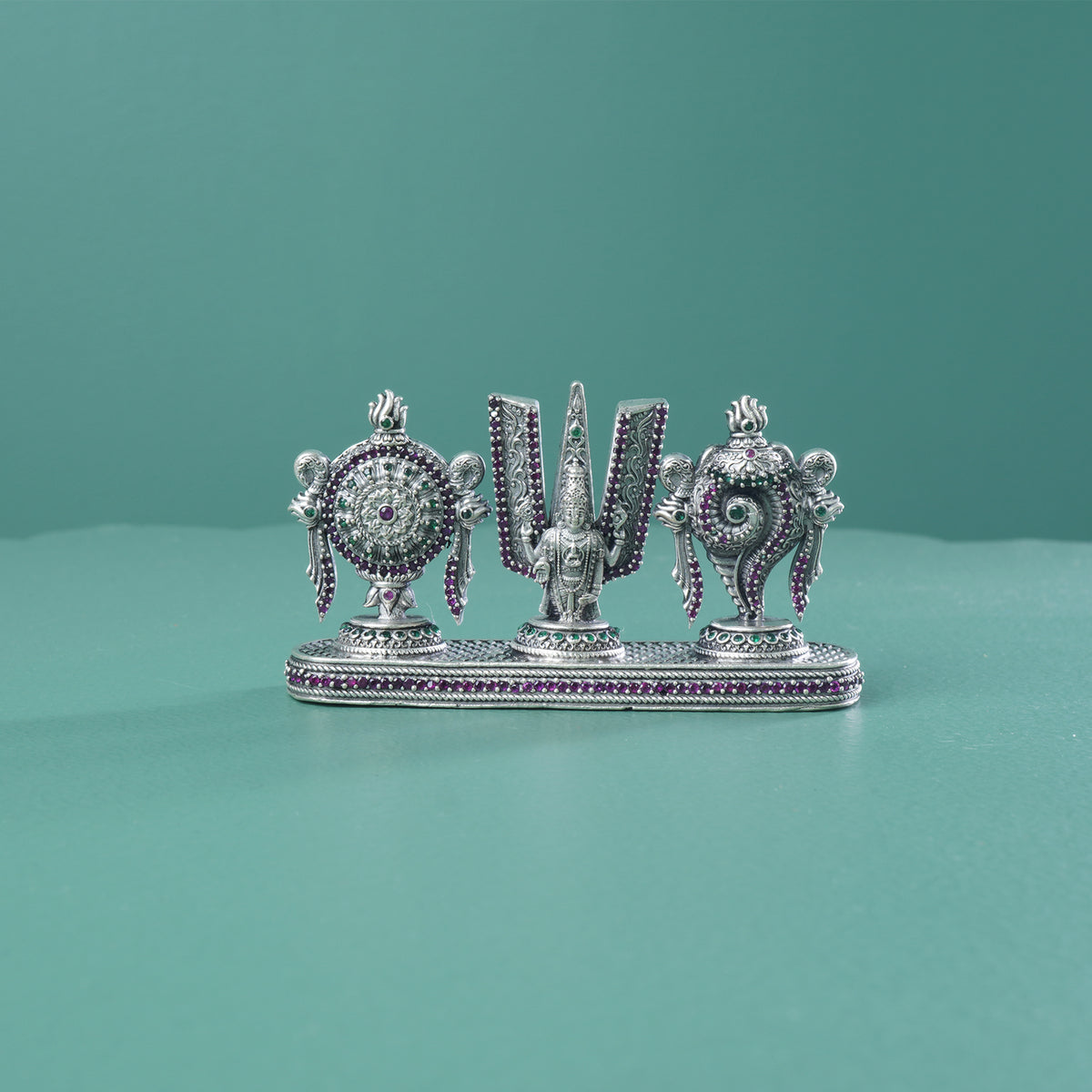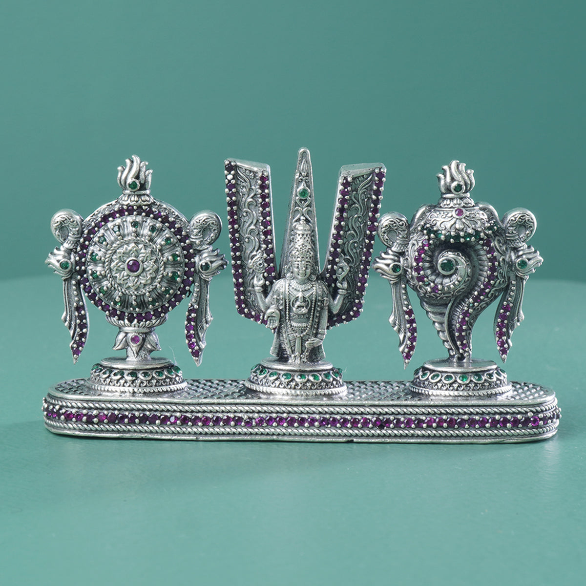 An regal shree balaji shanku chakra namam murti made in 92.5 silver and studded with handset stones. An elegant silver article design perfect for gifting .