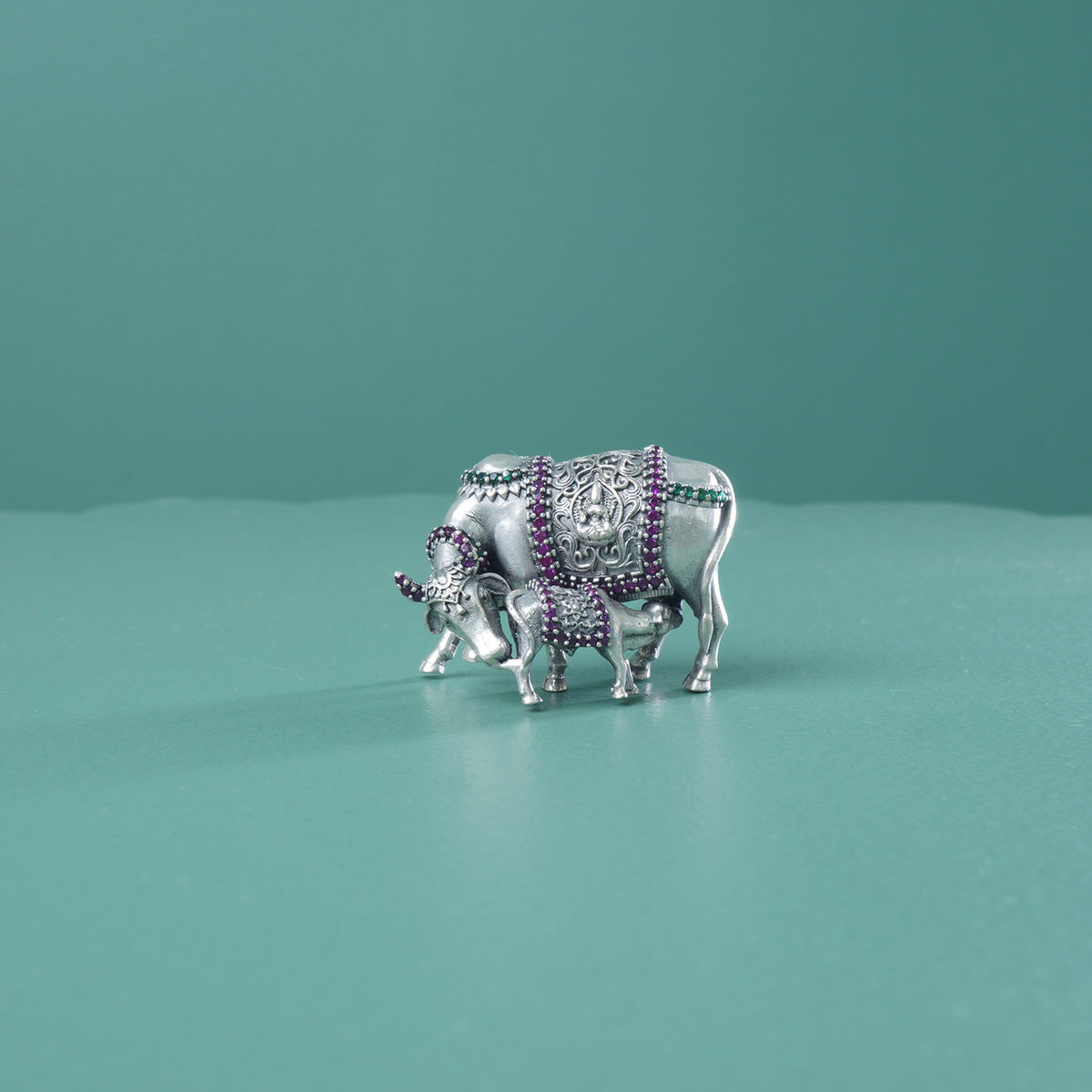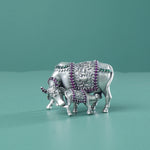 An regal silver gaay vasru murti also know as cow and calf idol made with finest of hands. The stone studded idol is perfect for gifting and is also know as silver Kamdhenu Cow & Calf Idol.